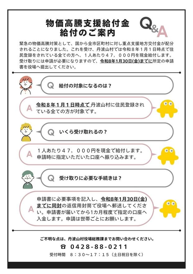 丹波山村では、物価高騰対応として、令和8年1月1日時点で住民登録をされている全ての方へ、一人あたり4万7千円を現金給付します。給付開始は、1月23日(金)を予定しています。 給付対象世帯には、役場から案内と申請書を郵送しています。振込先口座などを記入し、令和8年1月30日(金)までに同封の返信用封筒で提出してください。 ご不明な点は役場総務課(電話 0428-88-0211)へお問い合わせください。