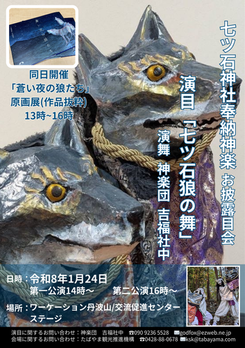 当日は、地域に伝わる狼伝承や、それをもとに生まれた創作芸能を、鑑賞を通じて楽しんでいただく機会とします。丹波山村の民俗文化や物語の魅力に触れていただければ幸いです。